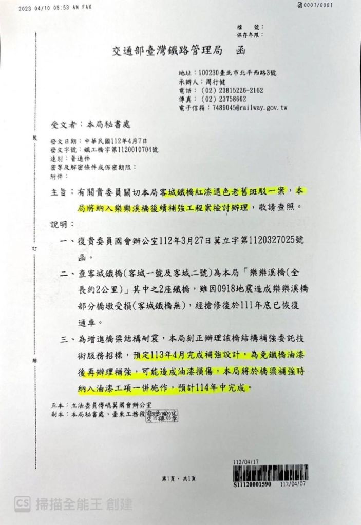 立法委員傅崐萁也多次受到民眾陳情,於112年3月27日去函台鐵局要求儘速辦理重漆以維護鐵道橋樑安全及帶動地方觀光發展,獲得台鐵局於同年4月7日回函表示,承諾將於今(114)年中完成。