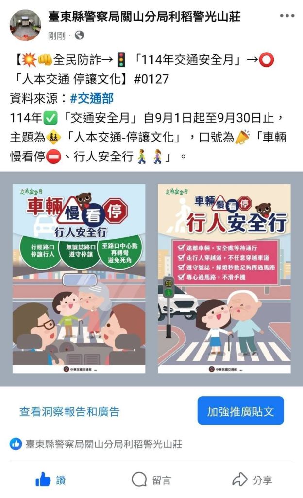關山警分局為響應交通安全月,特別規劃一系列宣導作為與執法措施,並以「車輛慢 行人安全行」為主軸,結合校園、社區、機關團體與媒體力量,共同營造安全交通環境。在實體宣導方面,分局於主要道路、學校周邊及社區要道懸掛大型帆布條,布告欄張貼交通安全海報,並行文商請轄內機關及學校LED跑馬燈同步播放交通安全口號,將安全觀念融入日常生活。同時,各分駐(派出)所員警更走入社區,積極參與各類活動,透過手舉牌宣導、現場互動,拉近與民眾距離,讓宣導更貼近生活。分局門口兩側也架設醒目的關東旗,提醒過往駕駛人及行人隨時注意安全。在媒體宣導部分,分局除受邀至警察廣播電臺臺東分臺專訪,廣播交通安全重點外,亦透過官網、臉書粉絲專頁,以及各分駐(派出)所與轄內社團所成立的LINE群組廣泛傳播,利用網路擴大觸及不同年齡層的民眾,形成線上線下的雙重宣導網絡。此外,也同步加強交通稽查作為,針對車輛未依規定停讓行人、超速、酒駕、違規使用手機等重大違規行為加強取締,展現執法決心。特別是針對「路口未停讓行人」部分,分局已規劃專案勤務,務求透過強化執法,提升駕駛人守法意識,保障行人通行安全。
