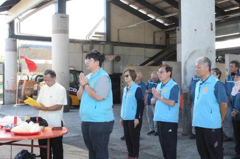 清潔隊依民間習俗,備好三牲、鮮果、罐頭餅乾等牲禮,邀請慶遠壇道士協助普渡事宜,隊員們依禮俗祈求工作平安,也表達對天地神明及四方好兄弟的敬意。在道士祈福下,吳慶展等人將淨水灑向垃圾車及資源回收車,象徵洗滌塵勞,庇佑車輛運行安全,也寄寓於垃圾清運過程能順利圓滿,整個儀式莊重溫馨,展現了清潔隊對傳統習俗的敬重與職務安全的重視。
