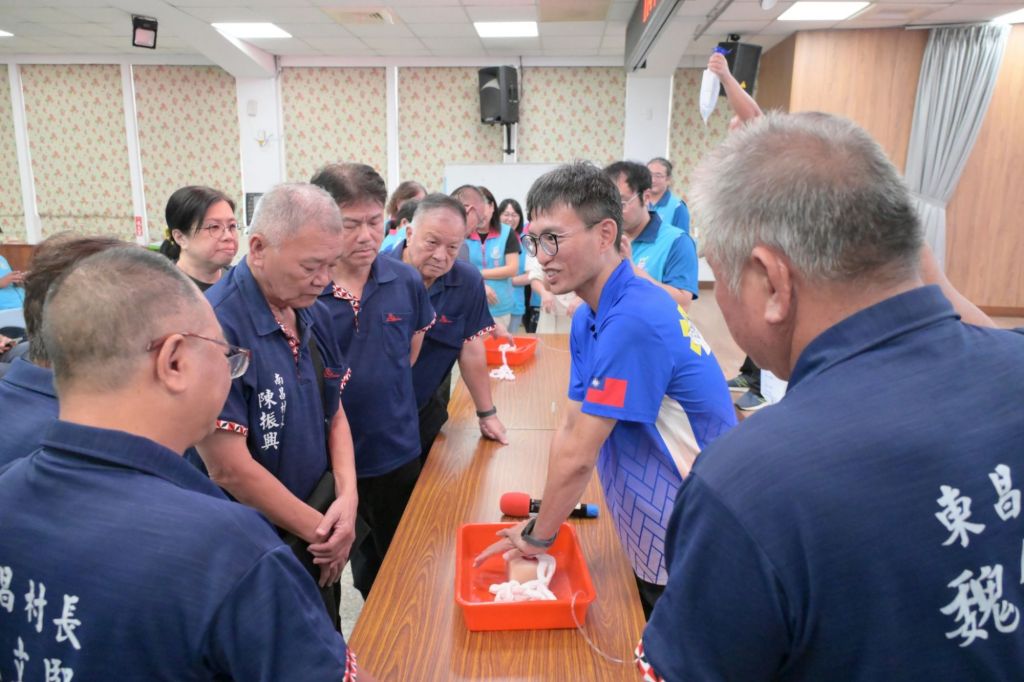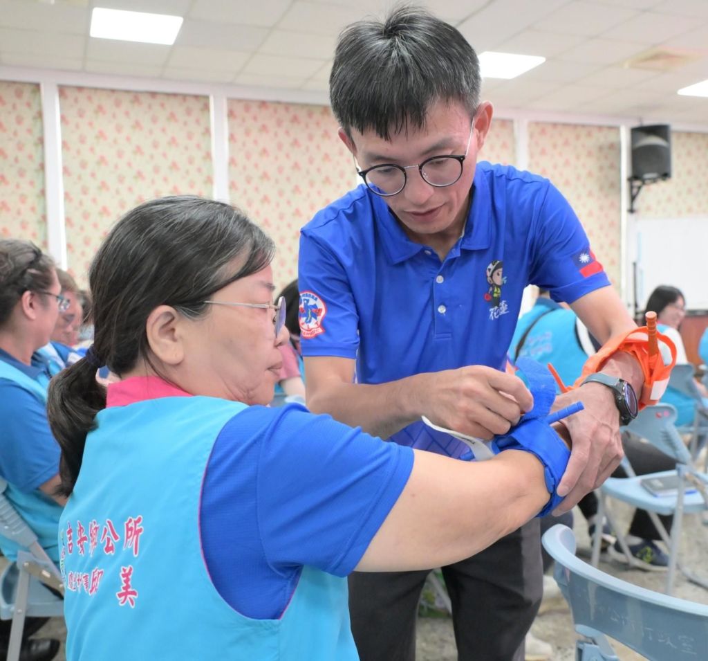 有感村鄰長與村幹事在下鄉走訪社區服務時,常遇到突發緊急救護需求,因此課程特別安排花蓮縣消防局吉安分隊任若男分隊長傳授心肺復甦術(CPR)、止血觀念與技術等實用技能。以及邀請花蓮縣消防局陳致豪科長講授防災協防中心組職與運作,藉以運用公部門與民間單位合作模式建立,以因應各種災害處理;藉由以上課程來鼓勵學員們透過反覆演練,習得正確應變知識,提升保命關鍵時刻的黃金救援,後續在洽公、走訪社區服務中得以即時運用。自救也能救人,有效延展共學推廣運用。