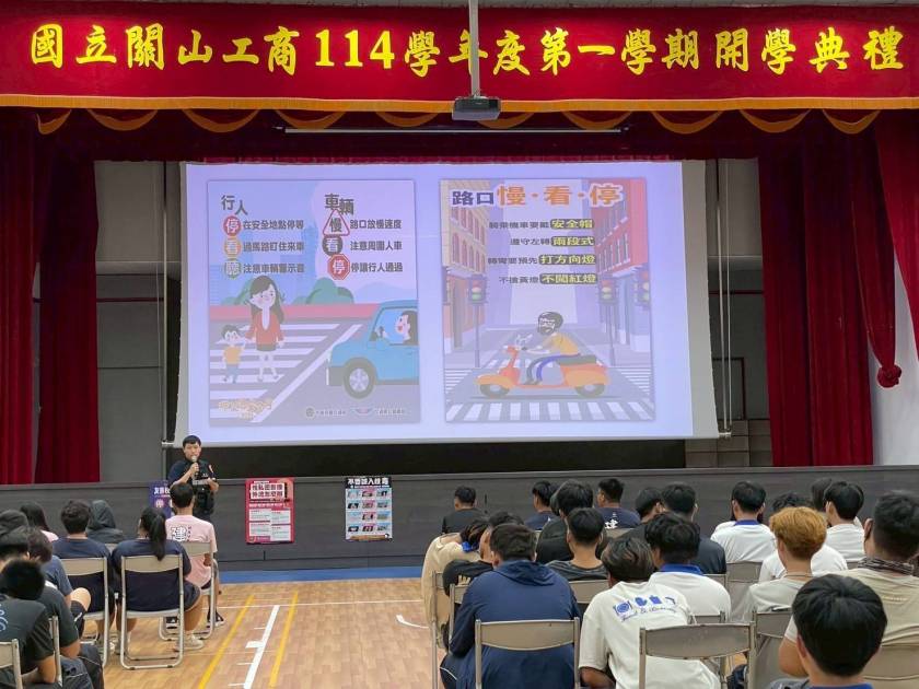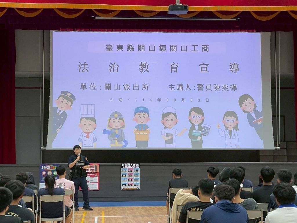 開學第一週,臺東縣警察局關山分局關山聯合所受邀至關山工商大禮堂,特別規劃一場「校園法治教育宣導」,藉由數百寸大型投影設備,向在場百餘位師生進行生動且深入的宣講,內容涵蓋交通安全月、反毒、反詐騙以及反霸凌等多元議題,期能透過面對面的互動,加深學子對法治觀念與交通安全的認識。此次宣講獲得師生們的熱烈迴響,現場不僅有同學主動發問,分享自己或身邊朋友的經驗,員警也耐心解答,讓宣導更具互動性與實用性。