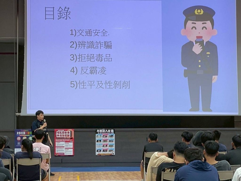 此外,也提醒同學們注意「反詐騙」議題。近年來詐騙手法推陳出新,尤其是假投資、假網購及交友詐騙,常利用年輕人涉世未深的弱點加以誘騙。員警透過投影片呈現實際對話紀錄與新聞案例,教導學生如何辨識「高獲利低風險」等不實話術,並強調如遇可疑情況,務必撥打165反詐騙專線查證。至於「反霸凌」則是校園中不可忽視的議題。員警強調,不論是肢體、言語或網路霸凌,都會對被害人造成嚴重傷害,甚至可能涉及刑責。呼籲同學們以尊重、同理心待人,一旦發現同學遭遇霸凌,應主動通報師長或警察,杜絕不當行為在校園內滋長。