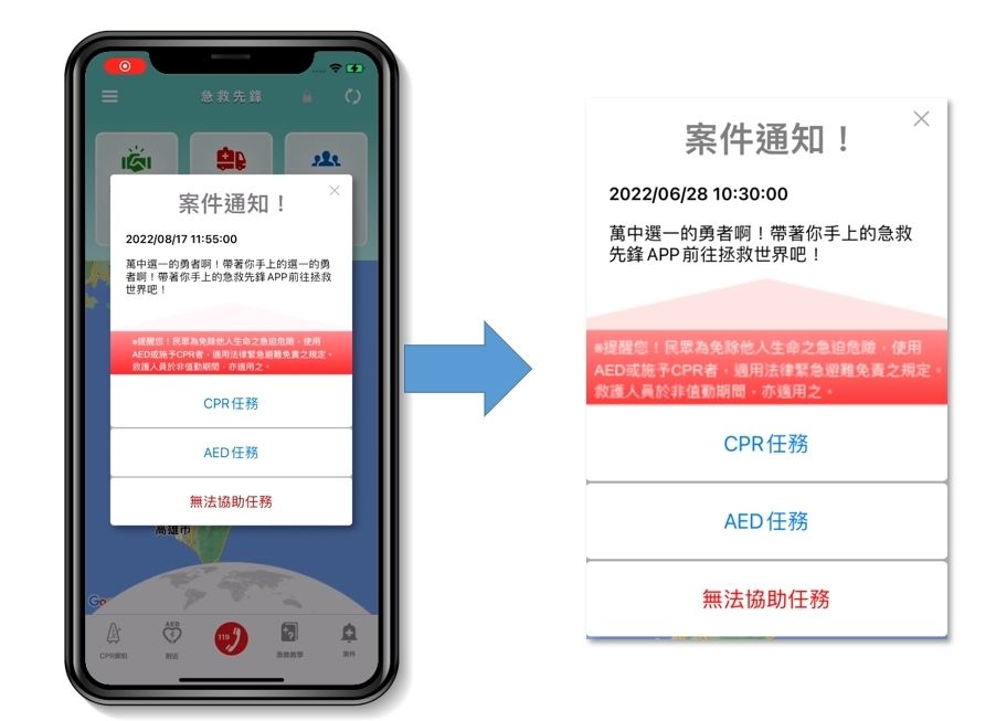 (一) 案件地圖與資訊:在消防單位受理民眾撥打119報案時,可於派遣救護車同時,推送訊息通知有下載「急救先鋒」App者,你可以選擇「CPR任務」或「AED任務」,也可以選「無法協助任務」。