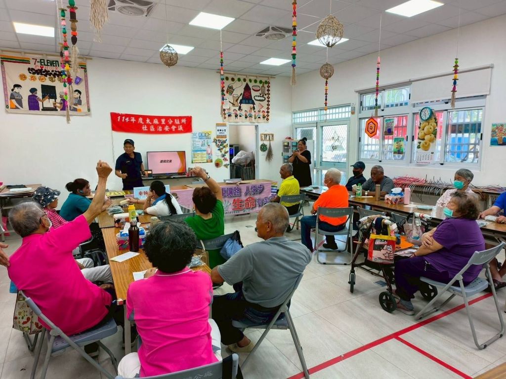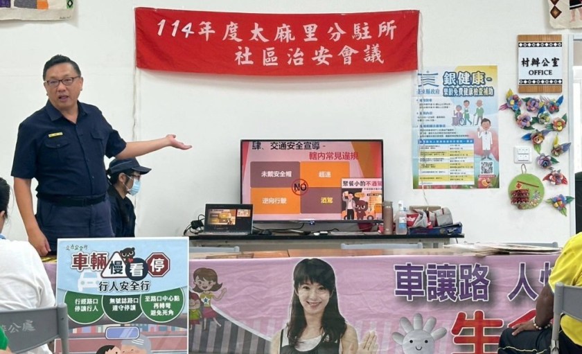 臺東縣警察局大武分局太麻里分駐所所長廖志宗日前走入太麻里鄉泰和社區舉辦治安座談會,向居民加強行人交通安全與反詐騙宣導。