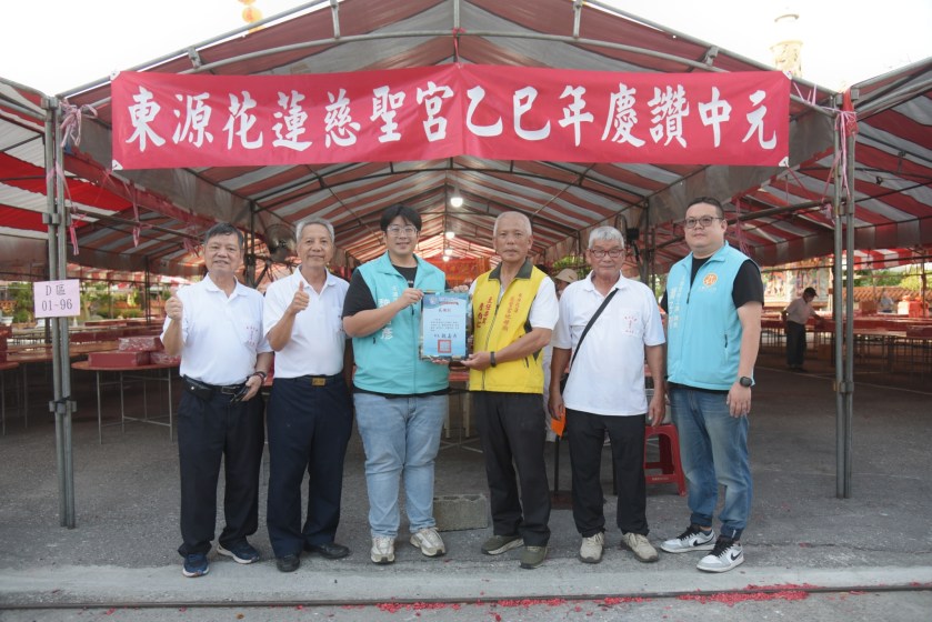 東源花蓮慈聖宮昨(13)日慶讚中元普渡,展現信眾團結與關懷社會的善心,特別捐贈100份生活物資予花蓮市公所實物銀行,由主委詹伯仁代表廟方致贈。慈聖宮主祀地母娘娘,信仰根植地方多年,中元普渡更象徵慎終追遠、濟世助人的精神,此次結合公益,為傳統祭典注入溫暖意義。