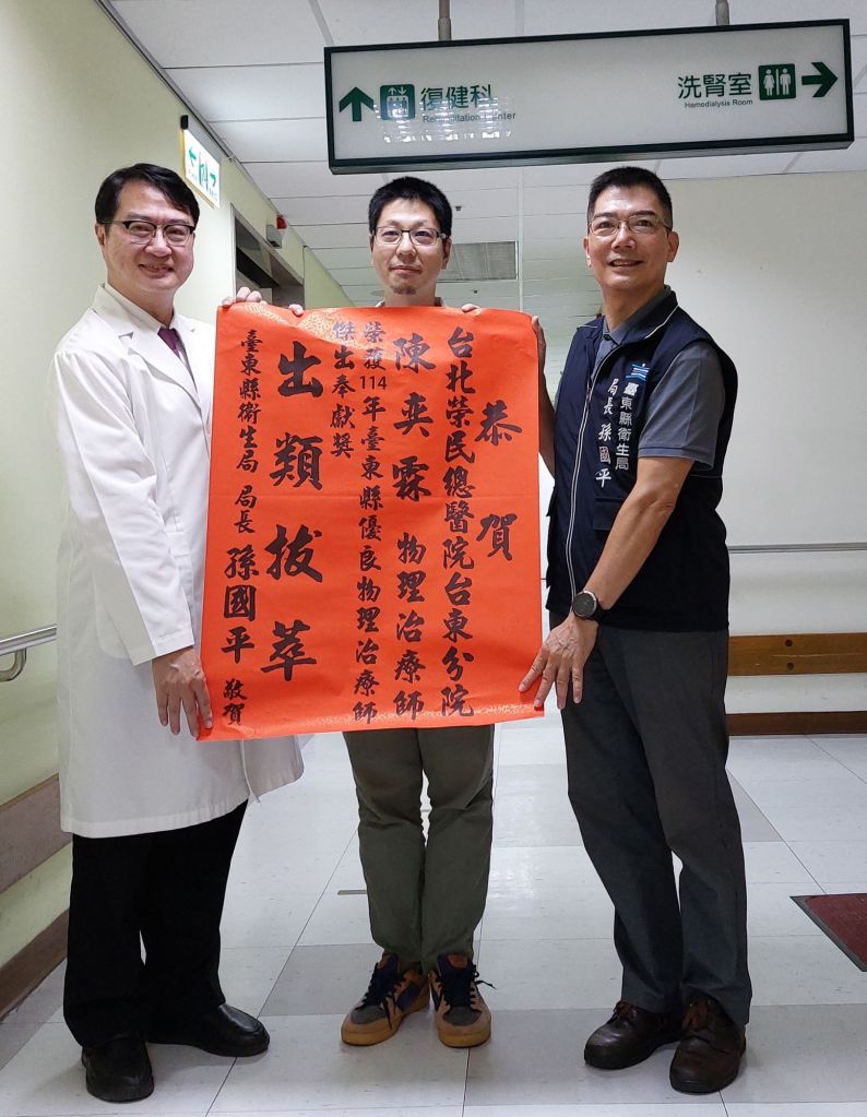 今(15)日,臺東縣衛生局局長孫國平親自贈送臺北榮民總醫院臺東分院物理治療師陳奕霖紅榜單,表揚其榮獲「114年度優良物理治療師傑出奉獻獎」。