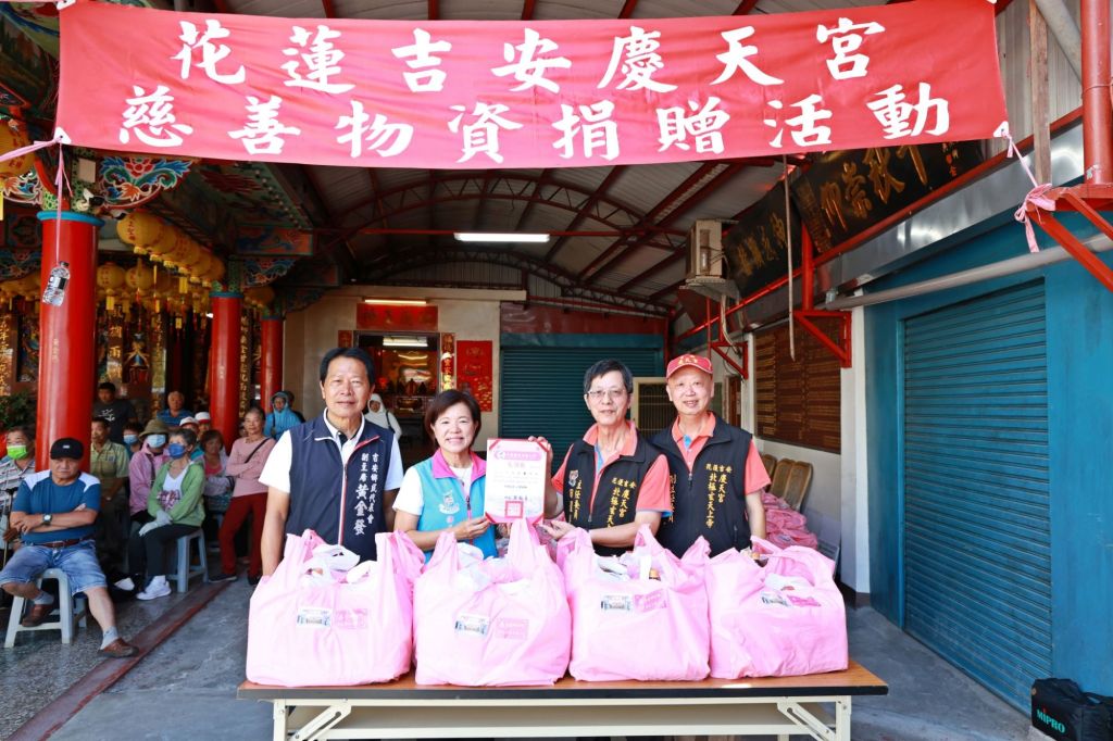 主祀北極玄天上帝的慶天宮肇基迄今逾一甲子,香火鼎盛,為慶豐村及周邊居民信仰中心。主任委員田耀華表示,該宮長年定期辦理捐贈物資活動及急難家庭救助,多次與公所合作,協力扶助弱勢個案。雖然能提供的資源有限,但希望匯聚信眾善心略盡棉薄之力,傳遞更多良善循環。此次捐贈的白米及綜合物資,已由游淑貞鄉長與鄉代會副主席黃金發現場分送給永安、慶豐、吉安、福興、南華、干城村的中低收入戶、中低收老人以及單親兒少家庭共410戶。