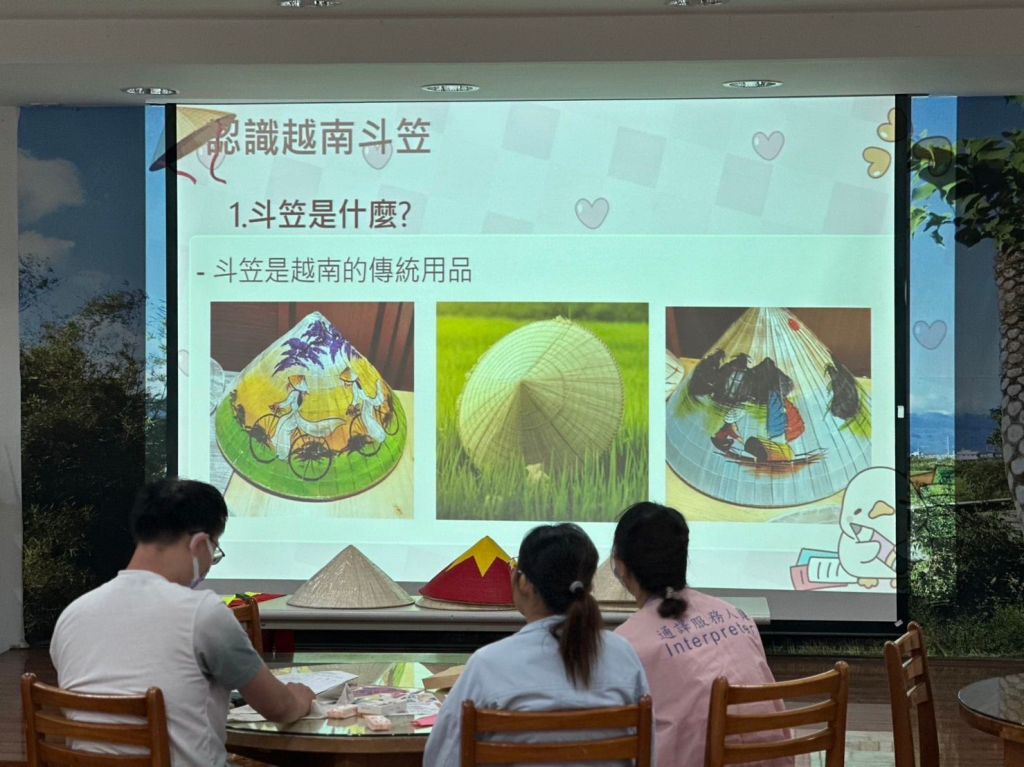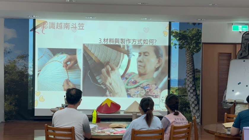 課程中講師特別為各國學員及其家屬解說深具代表性的越南斗笠繪製,讓在場學員體驗不同的多元文化經驗,斗笠是越南文化中的重要標誌,既是童年的回憶,也是家家戶戶熟悉的日常,其不僅是遮陽擋雨的實用工具,更是一種身分認同的象徵,常見於農民、婦女和街頭小販等日常生活中。它由竹條骨架、葵葉或棕櫚葉編織而成,並在內部用絲線固定成十六圈結構;據說,一位女子為了在每月16日與遠方的戀人相見,親手編織出了十六圈結構的斗笠,希望戀人隨身攜帶,讓她感覺無時無刻都陪在他身邊。這個故事讓斗笠的十六圈成為一種浪漫的象徵。現今越南斗笠已深具代表性,也受到國際品牌的青睞,甚至用於設計中,顯示其重要文化意涵。