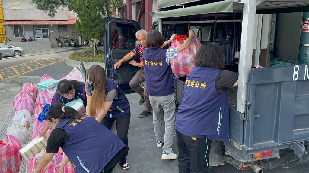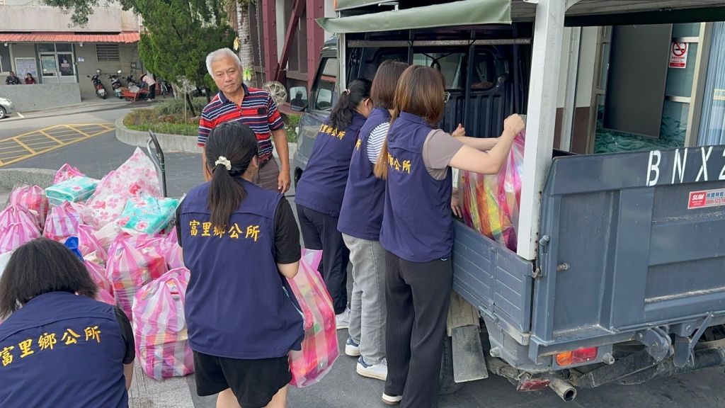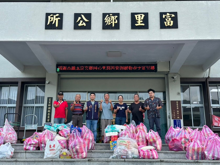 今(19)日上午富里鄉公所秘書張一民於公所大門口前接受高雄玉京玄都同心堂慈善會捐贈的愛心物資,並轉發給富里鄉7個村里(石牌村、明里村、富里村、永豐村、豐南村、富南村及學田村),由村長代表接受滿滿的物資並轉發給村裡弱勢村民,讓弱勢家庭能感受到社會的關懷與温暖。