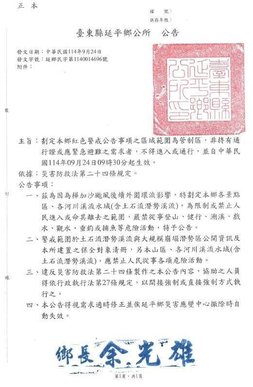 受颱風外圍環流豪雨影響,臺東縣延平鄉今(24)日發布紅色土石流警戒,臺東縣警察局關山分局延平分駐所警員田金漢立即配合延平鄉公所執行預警性撤離任務,與鄉長余光雄、公所職員及村幹部逐戶通知,協助村民安全轉移,展現警民齊心的防災行動力。