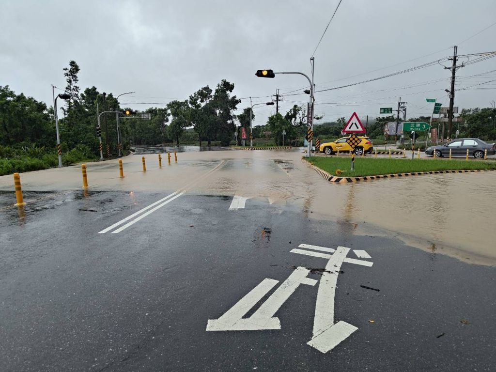 受到強烈颱風「樺加沙」外圍環流影響,臺東縣近日連續降下豪雨,鹿野鄉武陵三叉路口因排水溝遭雜草堵塞,導致雨水無法順利宣洩,造成路面大面積積水,最深達腳踝高度,對往來車輛及行人安全造成威脅。
