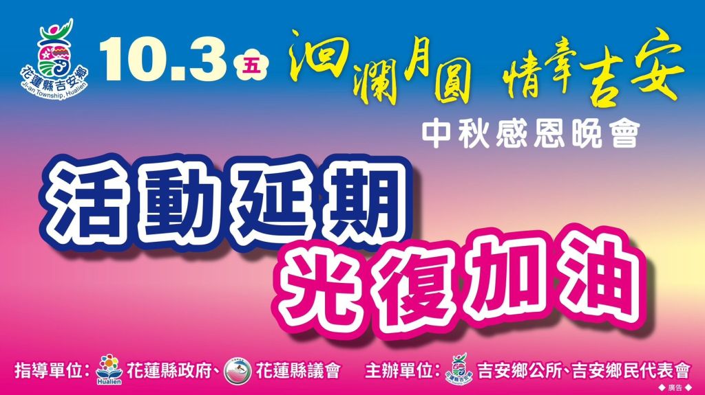 原訂於10月3日舉辦的114年「洄瀾月圓.情牽吉安」中秋感恩晚會,有感光復鄉近日遭洪水重創,全國投入救災與重建家園整復中,吉安鄉仍以同縣一家馳援救災為先,鄉長游淑貞今(28)日正式宣布,將活動延期舉辦!後續規劃能以更溫馨感恩的晚會呈現,且此時此刻是災民最需要陪伴度過的艱辛期,讓我們用祈禱與行動力表達敬意。