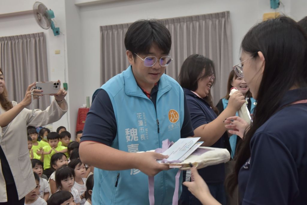 魏市長除了到場跟孩子們一起感恩老師外,也帶來了教師節禮物送給市幼的老師們,感謝他們細心且耐心地照顧每一位孩子;他說, 希望每一位小朋友都能了解不同節日的意義,感謝老師為孩子規劃設計那麼多活動,讓孩子學習尊師重道外,更瞭解心中充滿感恩是多麼可貴的事情;他也說,花蓮市公所會全力支持市幼的各項軟硬體發展,希望可以服務更多的小朋友與家長。