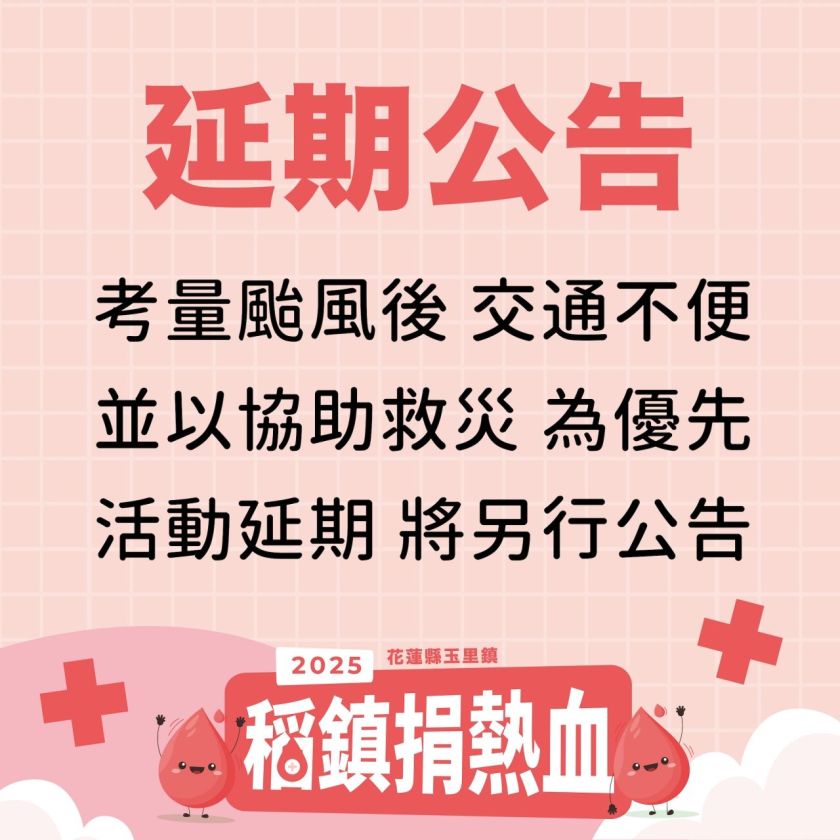原訂於 114年10月15日,由玉溪地區農會與玉里扶輪社共同舉辦的「稻鎮捐血公益活動」,惟因 0923 樺加沙颱風影響,造成馬太鞍溪橋損毀、交通受阻,造成醫療資源調度的困難,同時各界正全力投入救災與復建工作,為顧及安全及便利性,活動經協商後決定延期辦理。