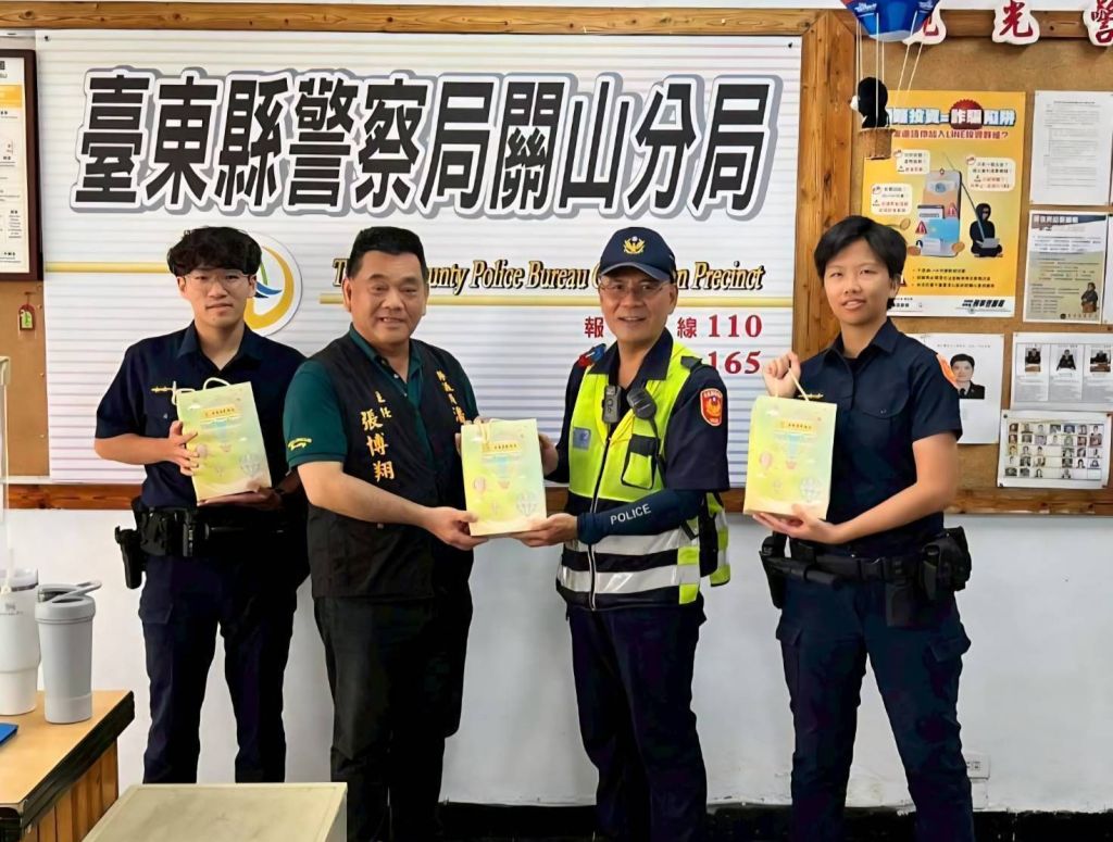 潘議員感念,關山警分局員警在熱氣球嘉年華期間,肩負交通疏導、現場秩序維護及民眾服務等多重任務,每位員警無論日夜辛勤值勤,都確保活動順利與遊客安全。此次禮盒由潘議員擔任董事的鹿野知名溫泉酒店精心製作,內含蜂蜜蛋糕、耳掛咖啡包及紅烏龍茶包,食材均來自在地農戶新鮮栽種或飼養的產品,健康又安心。蜂蜜蛋糕可在休息時享用,咖啡與茶包則能提神,讓員警在辛勞執勤中也能感受到暖心關懷。張博翔主任轉達潘議員心意時表示,嘉年華活動是臺東縣的重要觀光盛事,而員警的辛勞往往不為外界所見。潘議員希望透過兼具中秋節慶與在地特色的禮盒,向員警致上最深感謝,也提醒大家在繁忙工作之餘保重身心,平安順遂,能與家人共享團圓時光。