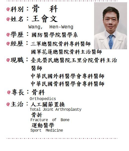 王會文醫師畢業於國防醫學院醫學系,曾任三軍總醫院骨科專科醫師及國軍花蓮總醫院骨科主治醫師,臨床經驗豐富,現任北榮玉里分院外科部主任兼骨科專科醫師。王醫師專長於人工關節置換、骨折治療及運動醫學,擅長針對退化性關節、意外外傷及運動傷害,提供病人精準的診斷與手術治療。