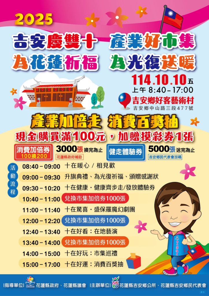 「產業加倍走,消費百獎抽!」為展現愛國情懷並活絡地方經濟,吉安鄉公所自109年起連續六年舉辦雙十節升旗典禮與創意慶典活動。今年更以「健走+市集+振興+祈福」四大主軸,推出【吉安慶雙十・產業好市集・為花蓮祈禱・為光復送暖】活動,將國慶慶典化為傳愛與行動的力量展現。