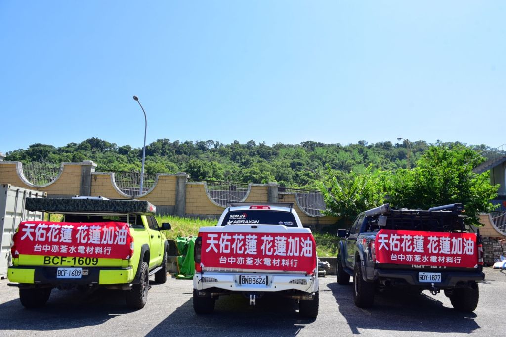 繼日前台中市長盧秀燕秉持「人飢己飢、人溺己溺」精神,率領「家具超人」團隊送來再生家具協助災民後,台中亦荃水電材料行負責人陳義仁與誠偉水電材料行老闆王振崇共同響應,決定捐贈價值逾百萬元的水電材料,並於今(8)日清晨親自派車運送至花蓮,五大台的皮卡滿載各種電器,包含58台抽水機、66台電子穩壓機、100組照明設備及大量插座與開關,這些正是受災家庭最迫切的需求。