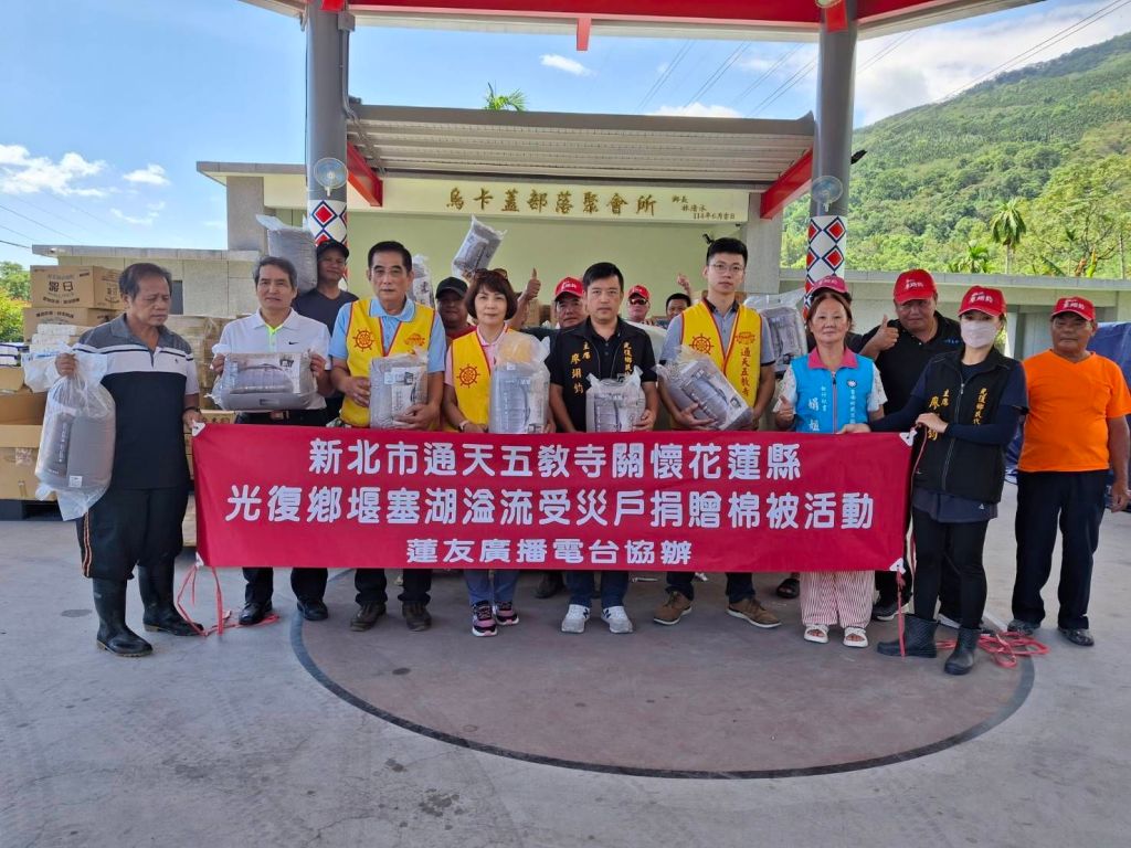 新北市通天五教寺及善心大德們暨蓮友廣播電台,關懷花蓮縣光復鄉馬太鞍溪堰塞湖溢流,捐贈石墨烯棉被300件,陪伴溫暖受災戶,通天五教寺楊董事長表示:看到電視新聞畫面出來時,內心難過不已,立即號召愛心大德們捐款買棉被,新北市愛心會員們非常踴躍捐助。蓮友廣播電台丁台長了解公益活動後,立即共襄盛舉,捐助10000元,主持人阿娟,與善心人士們踴躍参與活動,有錢出錢,有力出力。光復鄉代表會主席廖翊鈞感謝楊董事長及丁台長熱心公益,長期關懷原住民弱勢貧困家庭,給予急難救助及喪葬補助金。