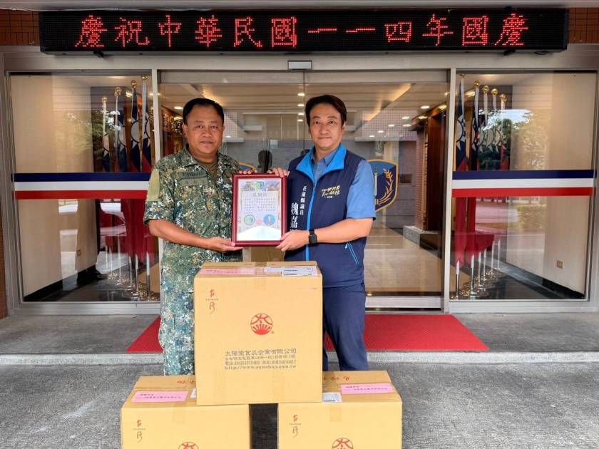 花蓮光復鄉歷經洪災重創,至今仍有許多官兵弟兄日夜留守災區,投入家園清理、道路搶修與復原協助工作。值此雙十國慶前夕,臺中太陽堂食品企業有限公司董事長雷坤滿特別拋磚引玉,捐贈30盒太陽餅,由花蓮縣議員魏嘉賢代表致贈予陸軍花東防衛指揮部,感謝國軍弟兄在災後復原任務中不分晝夜的辛勞與奉獻。