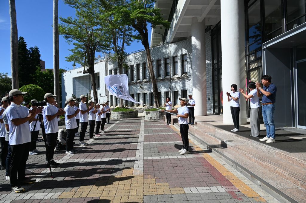 隨後縣長將縣旗授旗給這次代表隊體操選手游朝偉接受縣旗後,並在角力選手王紹文擊鼓下用力揮舞三下,並與現場領隊、教練、教育處同仁及選手在縣府大廳合影,提振代表隊士氣,大家也相約〔雲林見〕。