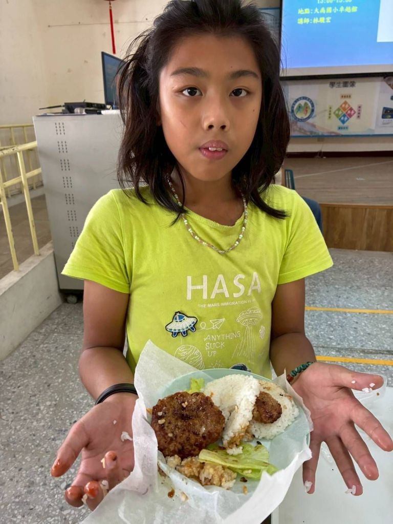 當第一個米漢堡完成時,孩子們忍不住驚呼:「好香喔!」有人咬下第一口後露出驚喜的表情:「原來米做的漢堡比麵包還好吃!」還有孩子問:「老師,這是你自己種的米嗎?」林駿宏老師笑著點頭,那一刻,孩子們彷彿真正理解了「吃」與「土地」的連結。