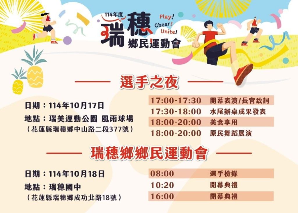 114年瑞穗全鄉運動會預於(18)日登場 鄉長邀請鄉親全家出動 2025-10-15 Bag 活動預告 發表留言 [東台先鋒報]記者 王凱軍/瑞穗報導 為迎接即將於10月18日在瑞穗國中盛大舉行的「114年度瑞穗全鄉運動會」,瑞穗鄉公所(17)日下午5時,於瑞美運動公園舉辦【選手之夜】造勢晚會,有精彩的藝文表演、在地美食市集,現場發送【限量美食兌換券】,先來先送,送完為止。 接著10月18日(星期六)早上8時30分,假瑞穗國中操場舉行【鄉民運動會】,各村代表齊聚競賽,展現團結與拚搏!瑞穗鄉公所誠摯邀請大家全家出動,一起感受瑞穗的熱情與活力!讓我們一起用運動的熱情,為瑞穗加油、為花蓮祈福。 分享此文: 按一下以分享至 Facebook(在新視窗中開啟) Facebook 更多 按一下即可分享至 X(在新視窗中開啟) X 喜歡 正在載入... 相關