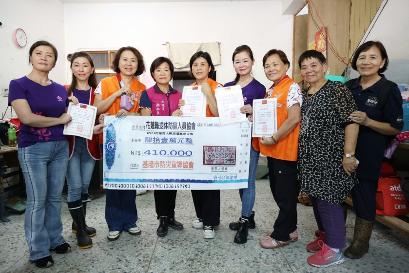 基隆張孟美大隊長在花蓮縣退休防宣協會理事長劉鳳娥、花蓮縣防宣種子教官王秀妹號召下,率領來自桃園、台中、宜蘭與台東等地,共15位防火種子教官親抵光復,各地防宣姊妹們不辭千里,以滿滿的關懷與祝福為光復防宣姊妹加油打氣。當游淑貞、劉鳳娥親自將濟助金轉贈至姐妹們手中時,現場氣氛溫馨感人,不少人熱淚盈眶並相互溫暖擁抱。來自光復的李姓防宣姊妹動情表示:「在恢復家園的時刻,收到全國義消防宣姊妹的愛心,心中的感恩難以言喻,真的非常感謝大家!」這份跨越山海的真情,正是防宣團隊「溫暖、堅毅、同行」的最佳寫照。