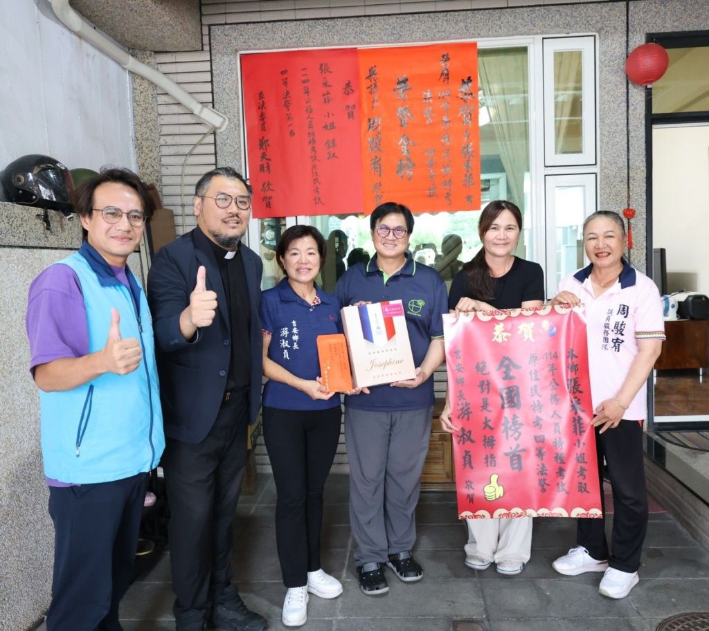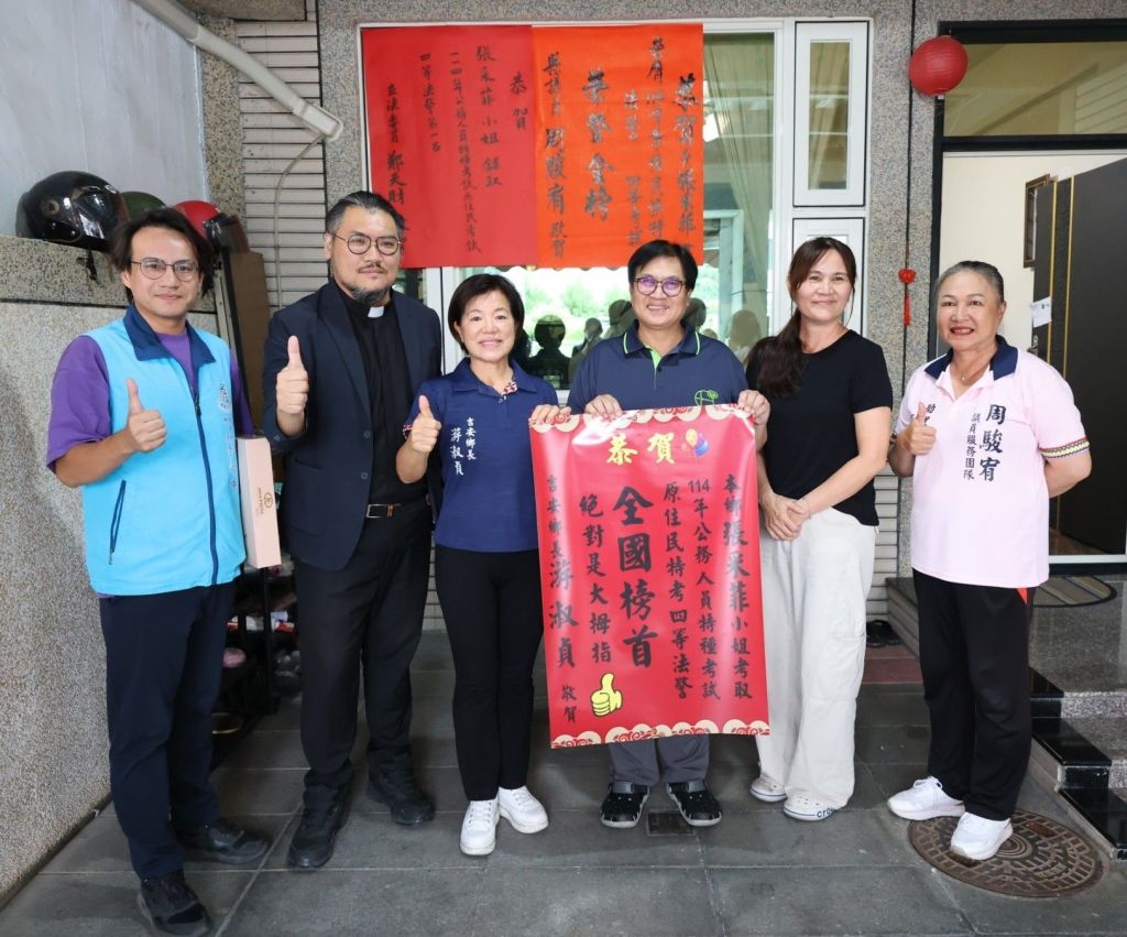 游淑貞鄉長偕同原民所同仁前往南昌村張采菲家中祝賀,現場親朋好友齊聚一堂,氣氛熱鬧又溫馨。由於張采菲目前於台北工作,當日由父親~田埔長老教會張祥意執事與母親代表領受紅榜,滿場掌聲與祝福聲不斷響起。親友們紛紛表示,張采菲出身軍警世家,父親為警察退休、兩位哥哥皆從軍報效國家。從小耳濡目染家人奉獻社會、堅守崗位的精神,使她立志報考公職、服務社會。