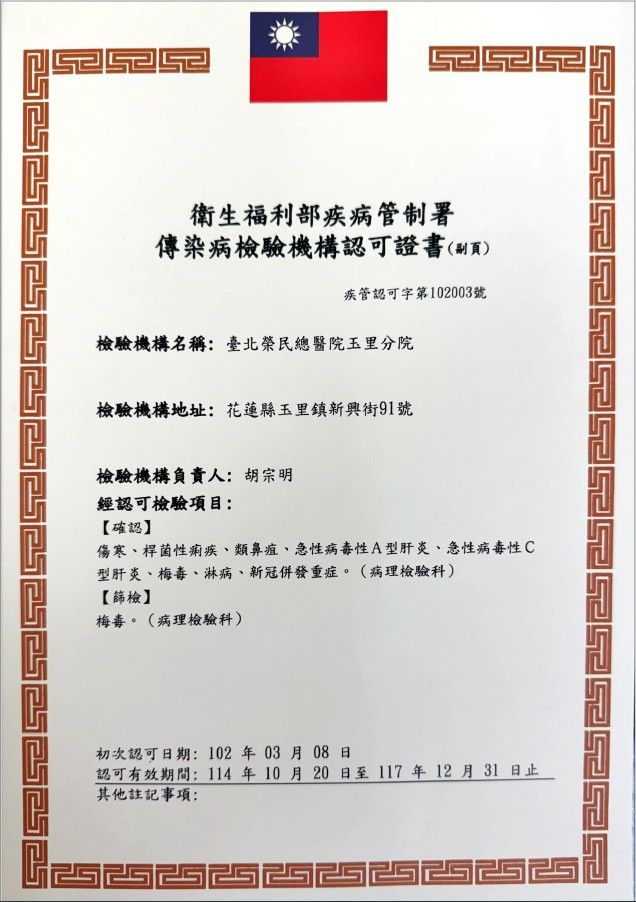 為守護花東民眾健康、強化傳染病管制,臺北榮民總醫院玉里分院持續精進檢驗量能,再傳佳績——繼多項傳染病檢驗項目獲得認可後,「類鼻疽檢驗能力」正式通過疾病管制署認可,成為東部地區具備確診檢驗能力的重點醫院之一。此舉不僅提升疑似個案診斷效率,也有助及早啟動治療流程,避免疾病惡化為重症,強化社區感染防線。
