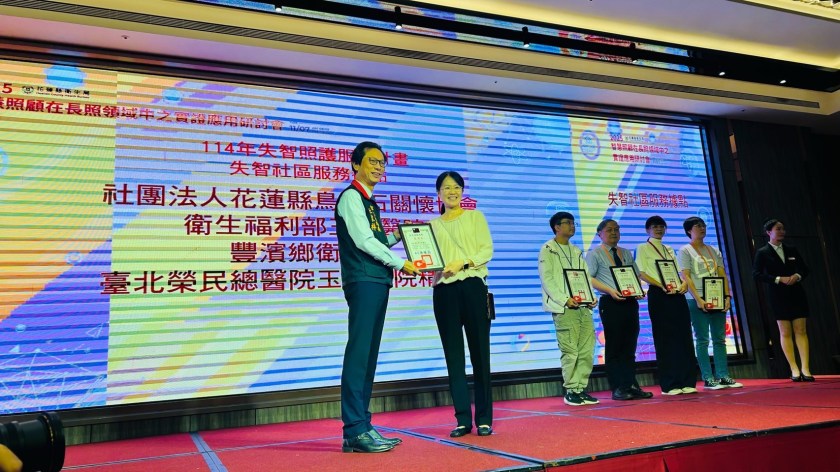 玉里醫院簡以嘉院長表示衛生福利部玉里醫院附設社區失智據點——慶豐樂憶學堂,在114年度花蓮縣失智社區服務據點計畫輔導查核中,榮獲花蓮北區第一名的佳績,展現此院長期深耕社區失智照護的卓越成果。此殊榮於「2025智慧照顧在長照領域中之實證應用研討會」中,由花蓮縣衛生局朱家祥局長親自頒發獎狀,並由長照司朱健芳司長及花蓮縣衛生局長照科黃秀茹科長一同見證,肯定玉里醫院在社區長照服務推動上的專業與用心。