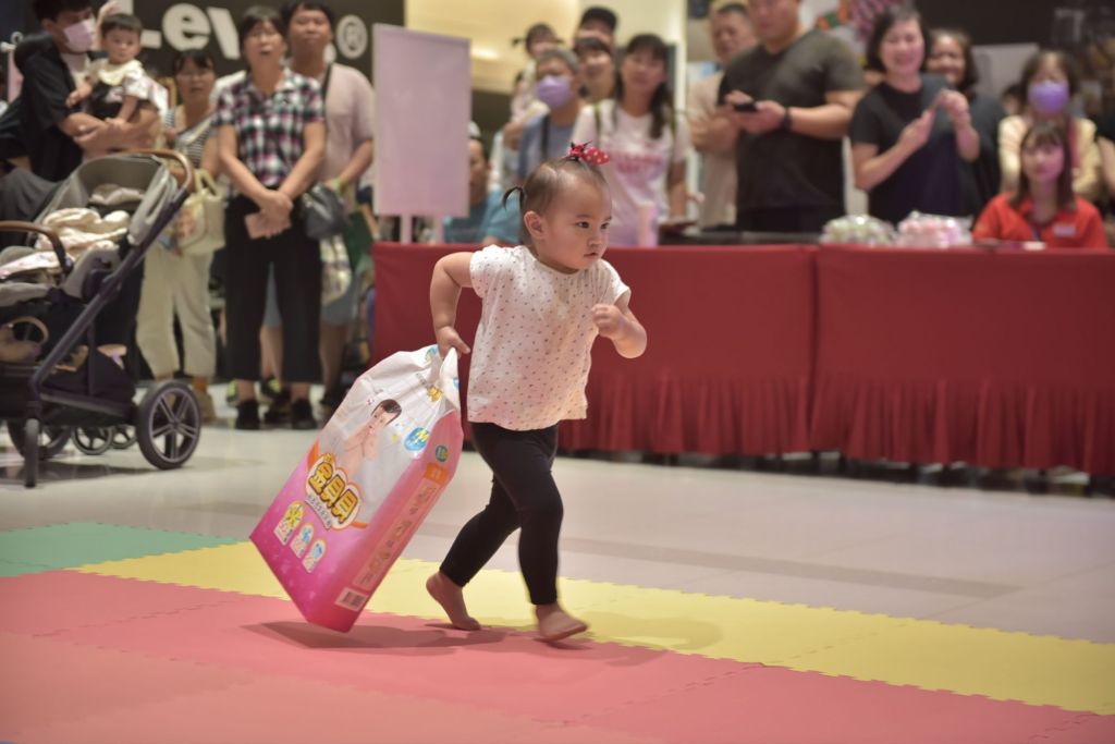 為完成寶寶搬尿布的任務,家長們在賽道終點處奮力吶喊加油,各出奇招吸引孩子們的注意力,有的寶貝展現宛如小小大力士的超強臂力,順利將尿布搬回指定地點,有的寶寶則忙著賣萌,睜大雙眼觀察大人們的逗趣模樣,更多的寶寶是在起點放聲大哭,或是不管尿布直接奔向終點找媽媽討抱抱,讓現場笑聲不斷。