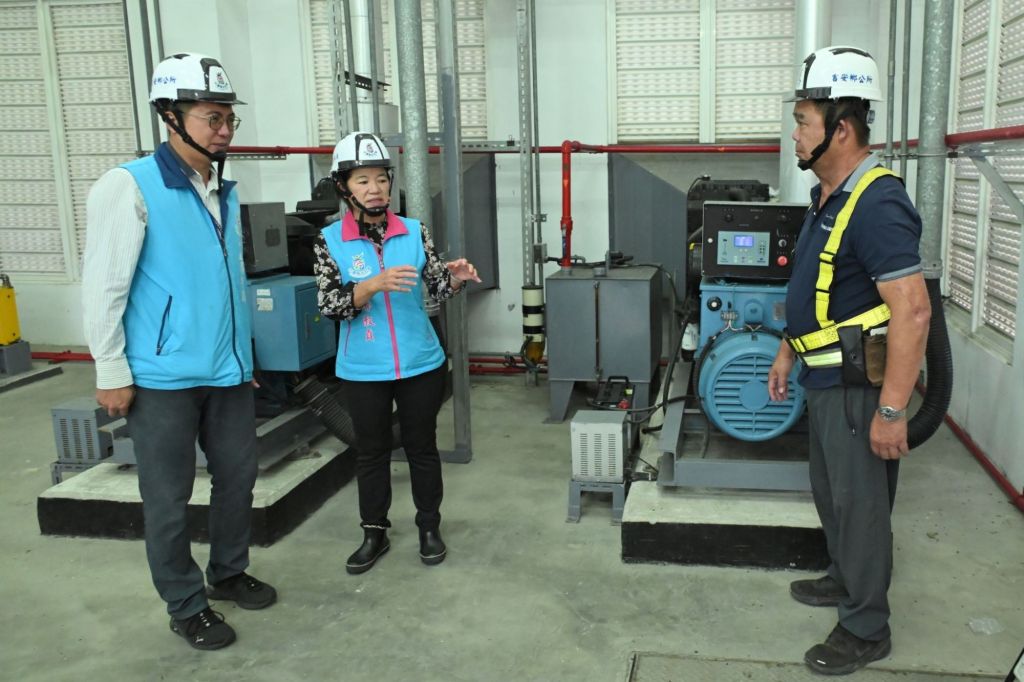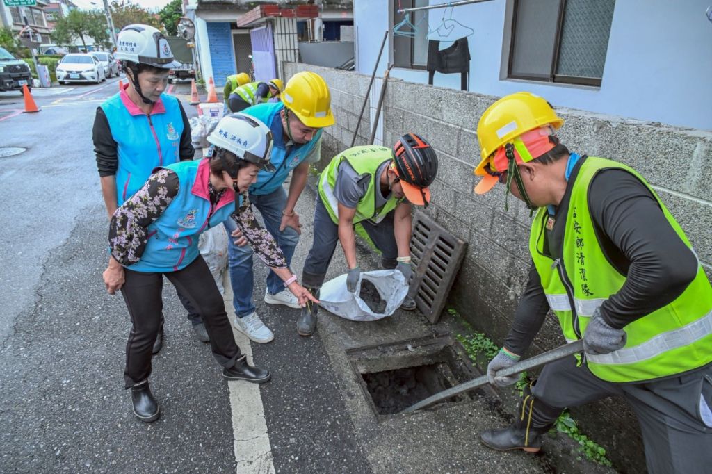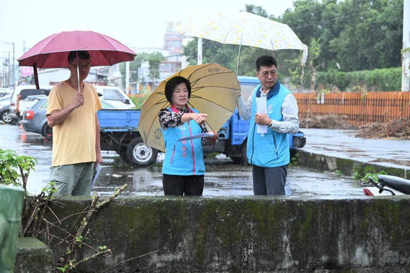 隨後偕同建設課前往榮光抽水站檢視設備運作情形,經現場測試均正常運作並備妥應變措施。接續前往北昌一街大排視察清淤成果,游淑貞提醒民眾切勿將垃圾投入水溝,以免影響排洪功能。她同時責成施工單位加強工地防護,防止邊坡坍塌與物料飛散,確保施工安全與周邊居民無虞。