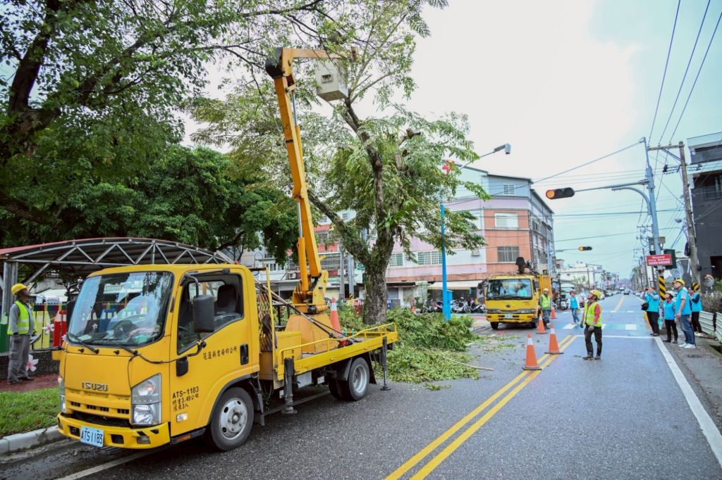 同時,清潔隊修樹班也針對吉安國中前人行道區域進行防颱修樹作業,重點處理遮蔽路燈、纏繞電線及受強風威脅的枝幹,進行矮化與疏枝修剪,避免颱風強風造成傾倒危害行人安全。整體作業秩序井然,展現公所防災整備的效率。