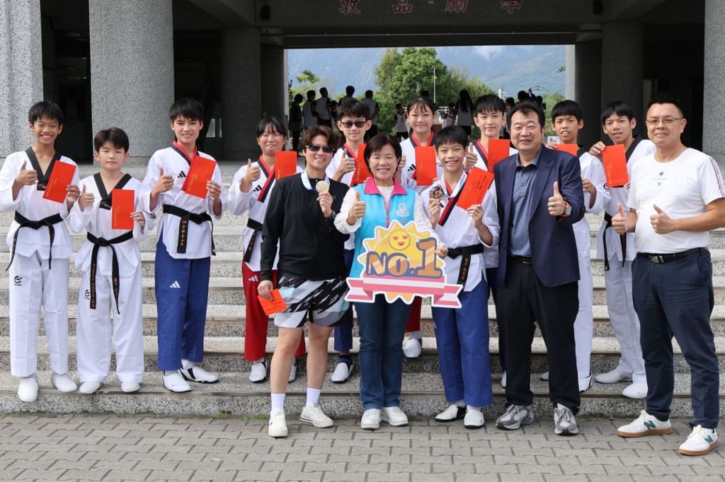 花蓮縣體育人才輩出,而吉安鄉公所更具行動力支持教育和各項賽能鼓勵發展。日前,鄉長游游淑貞前往國風國中,親自為跆拳道隊榮獲國際賽殊榮的教練與選手貼紅榜賀捷,並頒發績優獎勵金表揚。跆拳隊教練陳廖霞榮獲「2025雙北世界壯年運動會」跆拳道個人品勢第一名。八年級選手陳哲洋則在「2025亞洲青少年跆拳道品勢錦標賽」團體賽奪下第三名佳績。校長劉文彥、學務主任高宏忠及跆拳道隊九位隊員共同見證榮耀時刻,現場氣氛溫馨熱烈。