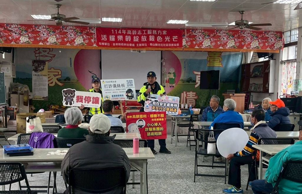 為提升高齡長者防詐意識與用路安全觀念,臺東縣警察局關山分局海端聯合所於昨(30)日9時,前往北庄活動中心,結合「114年高齡志工服務方案—活耀樂齡‧綻放銀色光芒」活動,規劃一場貼近長者生活的識詐、防詐與高齡化交通安全宣導,深受現場長輩與志工熱烈迴響。