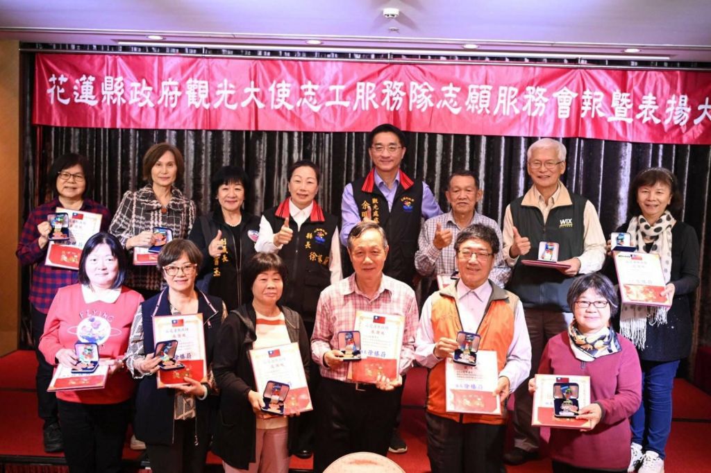花蓮縣政府為肯定觀光大使志工在114年度各類觀光推廣活動中的奉獻與成果,昨(9)日晚間於煙波大飯店舉辦「114年度花蓮縣觀光大使志工志願服務會報暨績優志工表揚大會」。活動由大隊長徐雪玉副議長、志工隊長紀有亭帶領志工團隊齊聚一堂,縣長徐榛蔚親臨現場頒發獎項,表揚16位幹部及25位服務時數績優志工,感謝志工的付出,為花蓮觀光投注暖心的力量。