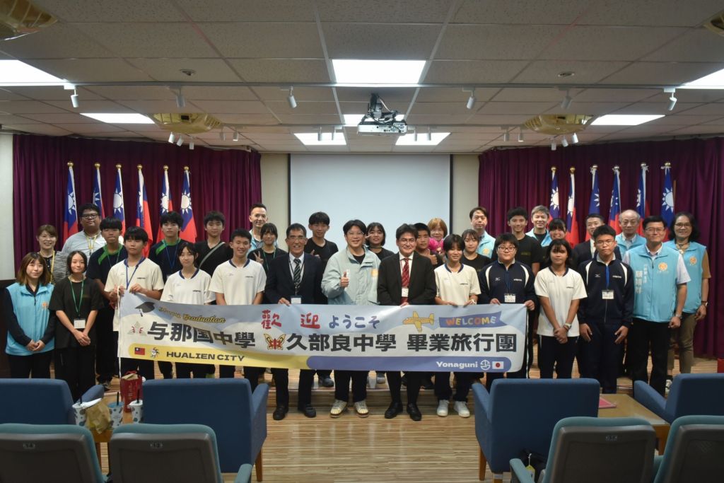 花蓮市日本姊妹市與那國町的「與那國中學」及「久部良中學」師生抵達臺灣展開畢業旅行,今(11)日下午他們專程拜訪花蓮市公所,受到魏嘉彥市長及同仁的熱情歡迎,大家揮舞國旗展現友好情誼,也祝福學生們在臺灣留下美好的回憶。