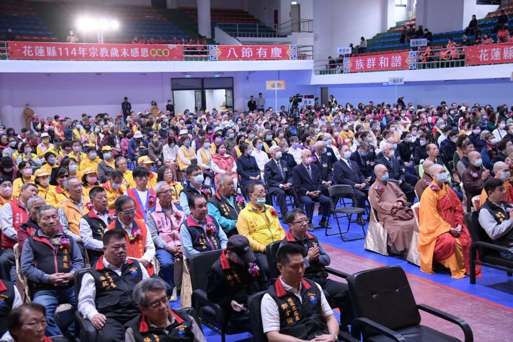 由勝安宮主辦、花蓮縣佛教會、原住民花蓮阿美族祭師團、花蓮縣所屬各宗教團體協辦的「花蓮縣114年宗教歲末感恩祈福會」今(20)日下午於花崗山中正體育館盛大舉行,花蓮縣長徐榛蔚受邀率領縣府團隊出席。縣長徐榛蔚擔任主祭官,立法委員傅崐萁、勝安宮主委柏瑞青、花蓮縣佛教會覺光大法師及原住民族祖靈代表花蓮市新夏部落頭目孫光輝、縣議會副議長徐雪玉、縣府秘書長饒忠、民政處代理處長李葳擔任陪祭官,帶領縣府各局處首長、花蓮縣各宗教團體代表、眾多貴賓以及鄉親,共同向各界神靈虔誠祈禱,祈求來年風調雨順、天災遠離,並特別為近期馬太鞍溪事故罹難者家屬祈福,盼宗教的溫暖力量能撫慰傷痛、安定民心。