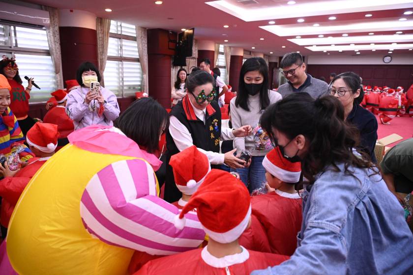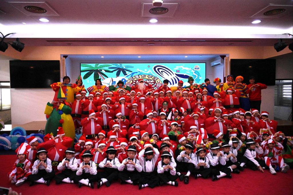在老師們的帶領下,上百名小朋友打扮成耶誕老人、小天使、小雪人、柺杖禮物等,天真活潑地唱歌、跳舞,天真活潑地報佳音,家長及不少縣府同仁也拿起手機拍照合影,讓現場增添許多歡笑。