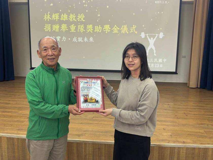 為支持偏遠地區體育人才培育,榮獲2025年宏道獎「奉獻體育—終生成就獎」、被譽為「台灣體大典範」的林輝雄教授,於昨(23)日蒞臨花蓮縣立三民國民中學,捐贈獎金設立舉重隊學生專屬獎學金,以實際行動鼓勵基層運動教練與體育選手,並將其一生奉行的運動員品格精神傳承給下一代。