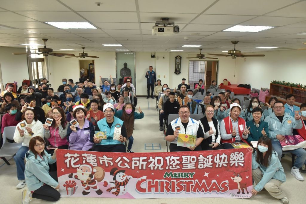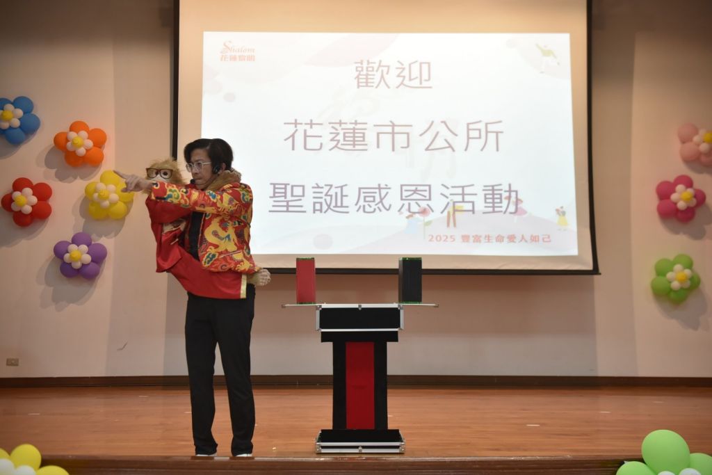 每年聖誕節前夕,市公所都會到市區各弱勢團體進行年終關懷,今(24)日平安夜的上午,包括市長魏嘉彥、花蓮市民代表會主席楊哲灃,市民代表陳惠卿、莊依婕、田珍綺,花蓮縣議員魏嘉賢以及市公所社勞課同仁一起化身聖誕祝福使者,前往畢士大教養院跟黎明教養院,致贈糖果以及禮品,將耶誕氣息與歡樂送進弱勢團體。市公所特地邀請魔術大師雷恩帶來精彩表演,有趣的互動、誇張的肢體語言逗得大家哈哈大笑,另外還有最為人所知的「猴賽雷」腹語演出,讓每一位院生看的目不轉睛。