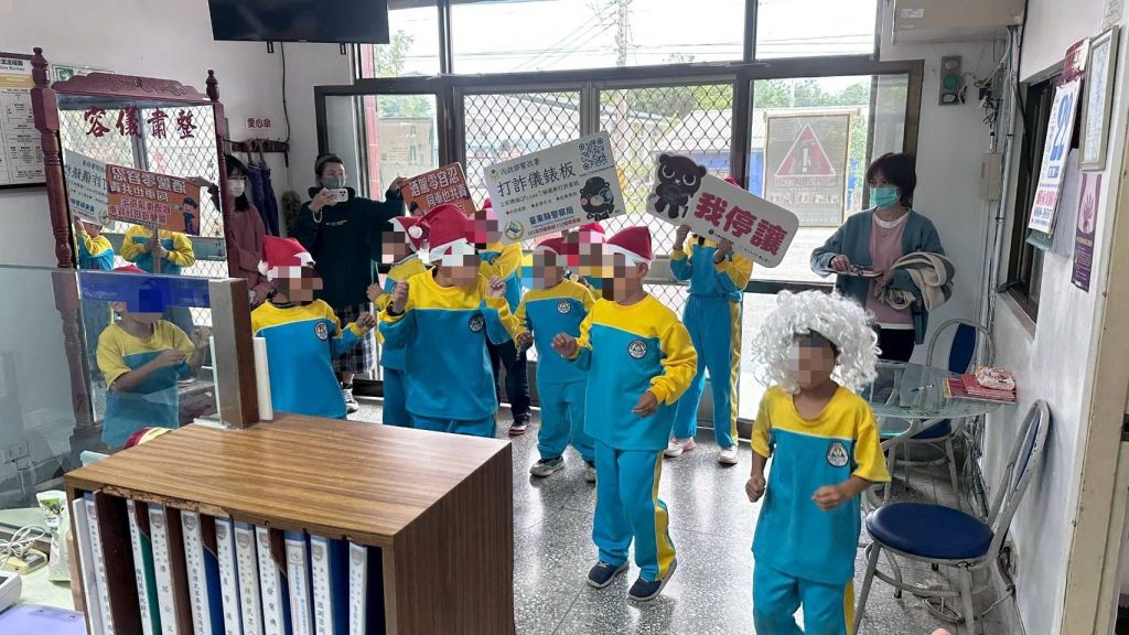 活動中,小朋友們戴著聖誕帽,隨著歡樂旋律手足舞蹈,純真的歌聲在分駐所內迴盪,讓平日嚴肅的警察辦公環境瞬間充滿歡笑與喜悅。員警陳信帆及洪于涵對師生們的到來表示熱烈歡迎,也頻頻為孩子們的精彩演出鼓掌致意,現場氣氛溫馨感人。除了報佳音活動外,員警也把握難得機會,向小朋友們進行生活安全宣講,內容包含兒童交通安全、上下學途中應注意的事項,以及如何保護自己的人身安全。員警特別提醒孩子們,過馬路務必遵守交通號誌、不奔跑、不嬉戲;放學後應儘量結伴同行,避免前往偏僻場所,若遇到可疑的人、事、物,一定要立即向師長、家長或警察求助,以確保自身安全。宣講過程中,員警也以親切互動的方式與小朋友們分享觀念,並特別澄清一個常見的迷思。所長黃自成表示,有些孩子會聽到大人說「不乖就叫警察ㄅㄟㄅㄟ來把你抓走」,其實警察並不是來嚇唬或抓走小朋友的,而是守護大家安全、在需要時提供協助的好朋友。透過這樣的說明,希望讓孩子們對警察建立正確且正向的認知,遇到困難時能勇於求助、不再害怕。