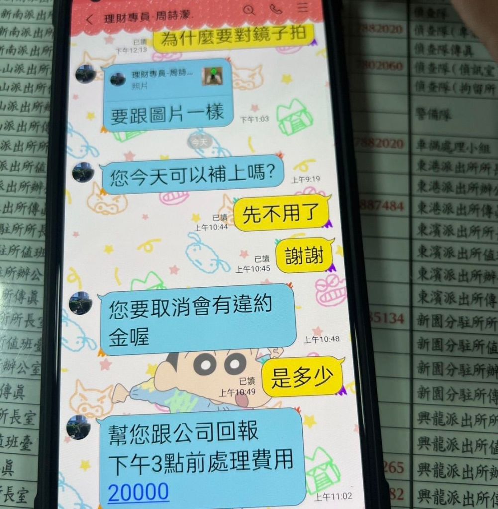 另一起案件發生於26日13時許,九如分駐所警員鍾偉成、鄭智謙擔服勤務時,一名40歲杜姓女子前來派出所諮詢,表示先前於抖音平臺認識友人,並被介紹至LINE平臺進行小額借貸,因急需用錢而與對方接洽,對方卻以其「操作失誤」為由,要求先匯款新臺幣2萬元,否則須支付違約金,杜女心生疑慮,遂前來請警方協助查證。