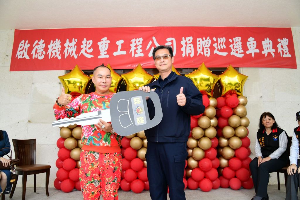 花蓮縣日前受連日強降雨影響,光復鄉馬太鞍溪發生潰堤,造成周邊地區淹水及公共設施受損,影響居民日常生活與交通安全。災害發生當下,花蓮縣警察局員警立即投入交通疏導、警戒管制、協助民眾撤離及維護災區秩序等工作。巡邏車無論是在治安維護、交通執法、偏鄉巡查,或天災時投入救援、通報及安全警戒,均屬執行任務重要裝備,胡漢龑董事長得知基層警政及救災勤務實際需求後,即公開承諾捐贈巡邏車,以實際行動支持地方治安與防災工作。