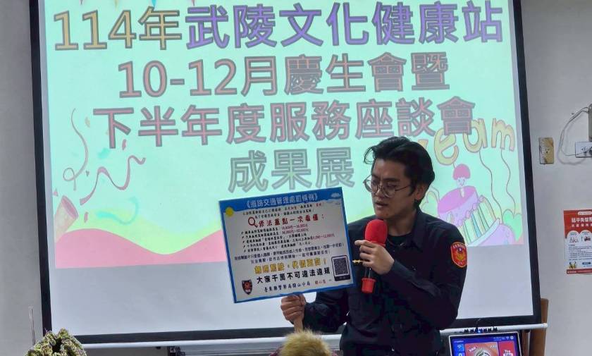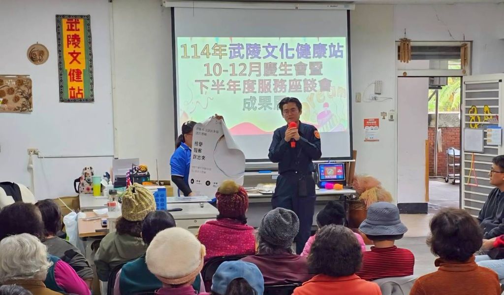 臺東縣警察局關山分局武陵派出所為強化高齡族群安全防護,於昨(29)日10時,應邀前往武陵文健站舉辦之「10至12月份慶生會暨114年下半年度服務座談會活動」中,由警員吳文彥及黃冠霖擔任宣講人員,向現場約40多位長者進行防詐騙及交通安全宣講,透過貼近生活的案例說明與互動方式,提升長者自我保護意識。