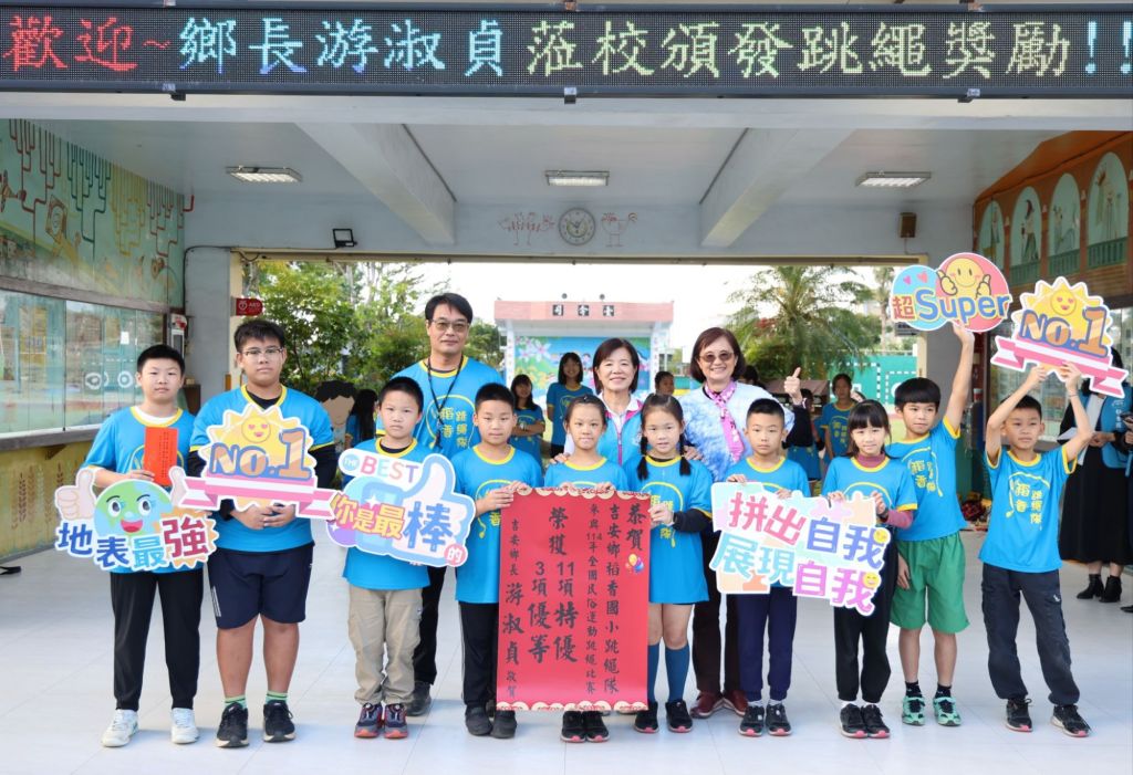 「繩」乎其技~花蓮縣吉安鄉教育軟實力再度驚豔全國!鄉長游淑貞日前上午偕同公所團隊親赴稻香國小,為跳繩隊及空手道小將張貼紅榜、頒發獎金並加碼致贈精美禮品,肯定師生在全國競賽的卓越表現。學子們日前遠征臺南,參加114年全國民俗運動匯演,一舉拿下「11項特優、3項優等」;另有梁芳芸同學勇奪第25屆總統盃全國空手道錦標賽國小女子個人型第一名,為吉安鄉長期扎根多元藝能與體育教育寫下亮眼里程碑。