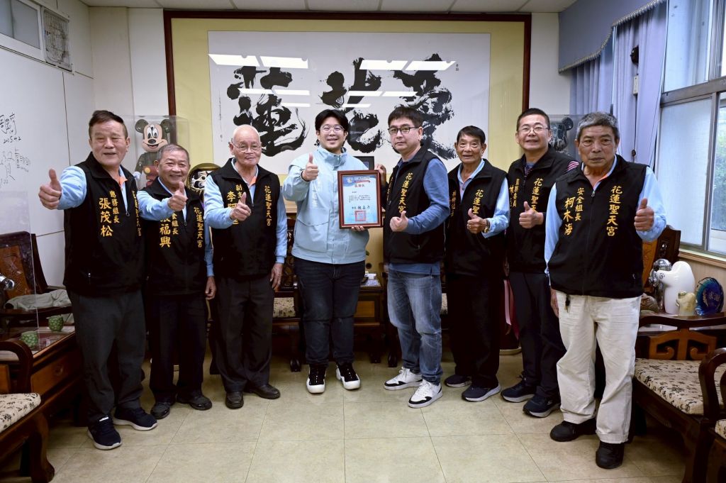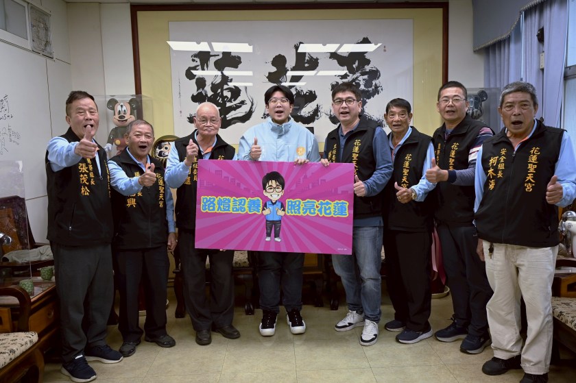 花蓮聖天宮主委蔡貿全及管委會成員今日到花蓮市公所,捐贈5萬2千元認養路燈,這也是聖天宮連續8年響應認養路燈活動,每年皆認養52盞,點亮進豐街、商校街、明智街、明心街等宮廟周邊街道。