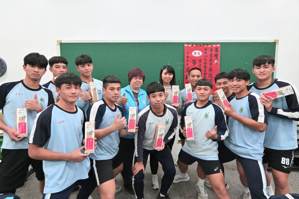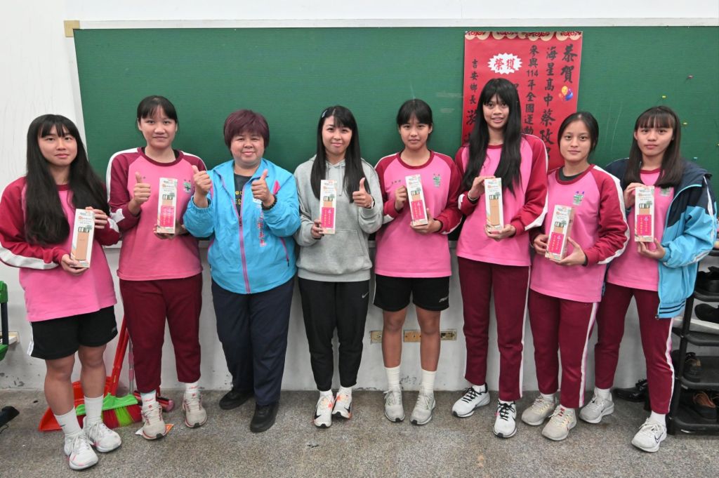 游淑貞鄉長特別委由秘書謝美惠前往海星中學張貼紅榜、頒獎,現場由教練亓玟心代為領取蔡政男與金吳復凱的獎勵金。亓教練表示,男子組此次比賽面臨新老選手交接的「換血」壓力,選手多為高中生,在陣容如此年輕的情況下,男子隊能拿下第三名已屬不易。她非常期待這群孩子經過磨練後,經驗會更成熟,未來在賽場上更加游刃有餘。