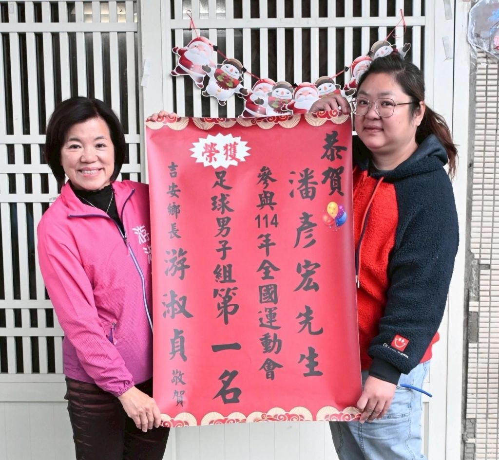 吉安子弟再傳捷報!海星高中蔡政男與東華大學金吳復凱在「114年全國運動會」卡巴迪項目中勇奪社會男子組第三名,海星國中梁品蓁則於「2025年第25屆總統盃全國空手道錦標賽」及「114花蓮縣全縣暨社區全民聯合運動會」中勇奪雙金,此外來自干城村的足球好手潘彥宏亦在114年全運會中勇奪足球男子組第一名,展現吉安學子在各項運動領域的亮眼實力。吉安鄉長游淑貞獲悉捷報後,對選手們的優異表現表達肯定,並前往張貼紅榜、致贈獎勵金及實用小禮物獻上祝賀。